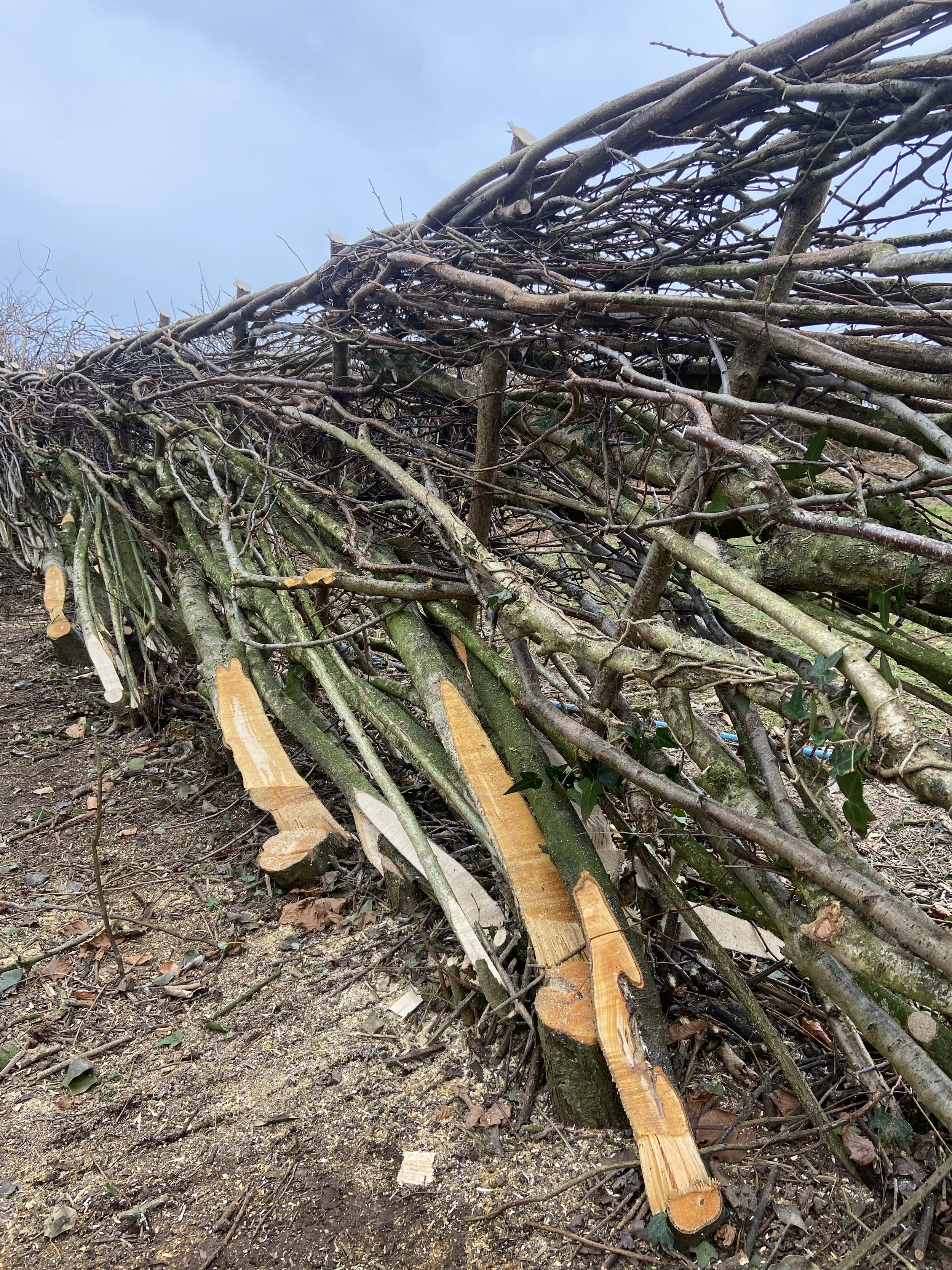 The stakes are set at an angle in the opposite direction to that of the laid stems and are then bound to add rigidity to the structure. This hedgerows primary function was the retention of sheep.